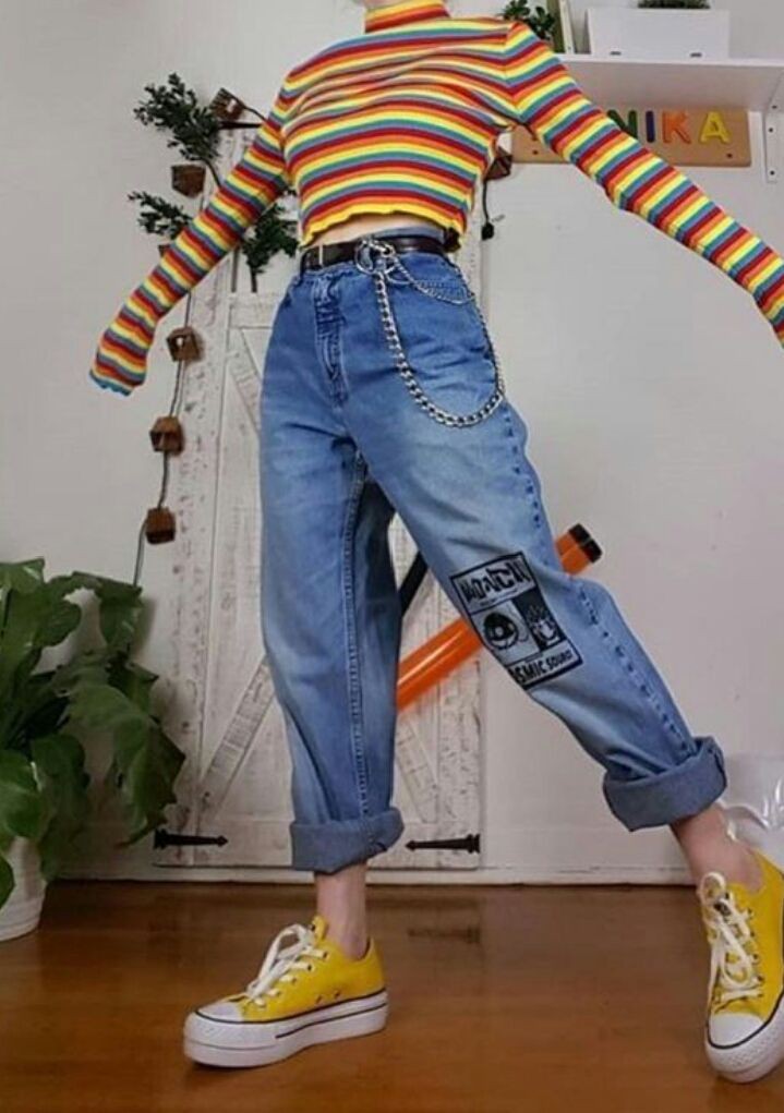 Trata de que sea colorido y puedes usar camisas o faldas ochenteras. También unos jeans sueltos y accesorios como lentes, pulseras, bolsos, etc.